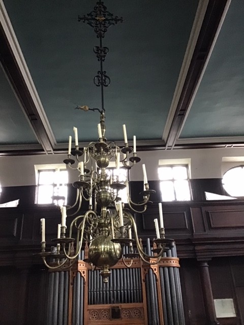 The central three-tiered chandelier is an original fitting. It is of Dutch manufacture, a reminder of the strong links between East Anglian Dissenters and their counterparts in the Netherlands. It holds twenty-four candles and makes a magnificent sight when ablaze on a winter’s evening! The wrought ironwork on which it hangs is not original, however, and probably dates from 1900 when the ceiling was replaced.