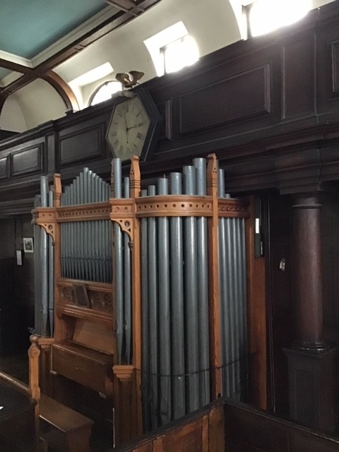 The organ, built by the Ipswich firm Bishop and Sons in 1878, was installed in the Meeting House – its third home – in 1900. It has two manuals and sixteen stops. It is the third organ the Meeting House has had. The first was installed in 1799 and was first played on 17th March of that year. It was located in the north gallery, as was the second organ, installed in 1865. In 1885, however, it was moved downstairs, where it was damaged in a flood.