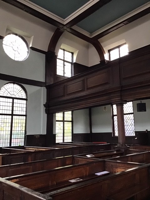 The box pews are characteristic of the 17th Century and are original. However, the two main blocks of downstairs pews are rearranged in the 1900 restoration so that all the seats face the front. Originally, the pews had seats on three or four sides, and this arrangement can still be seen in the large pews abutting the east and west walls. One of these, on the east side, contains a sample of the original white brick flooring, replaced elsewhere by wooden parquet in 1900. The pews in the galleries are in their original positions.